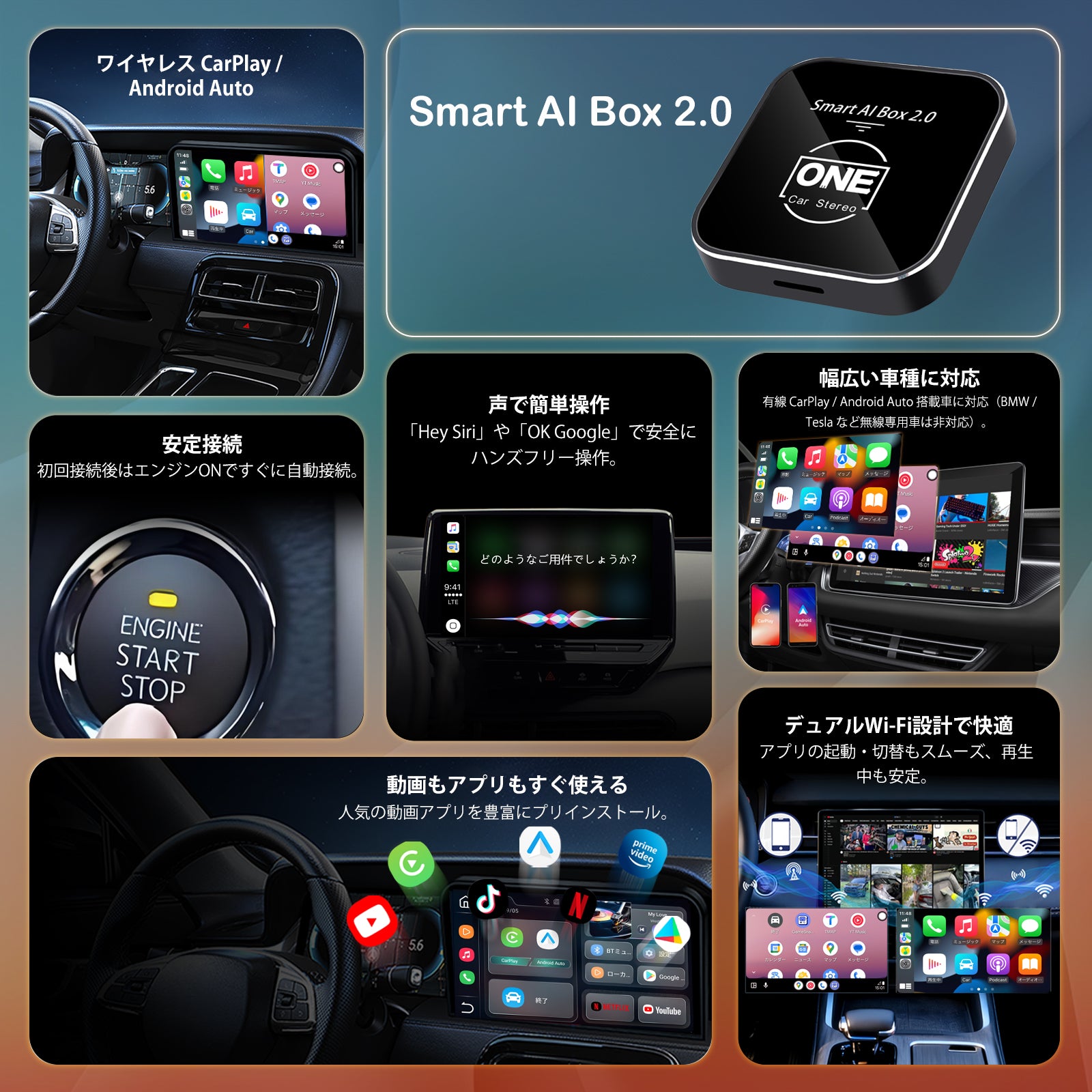 Smart AI Boxは、車内の純正ディスプレイをより便利で快適なエンターテインメントシステムへアップグレードするデバイスです。主な機能は以下の通りです。